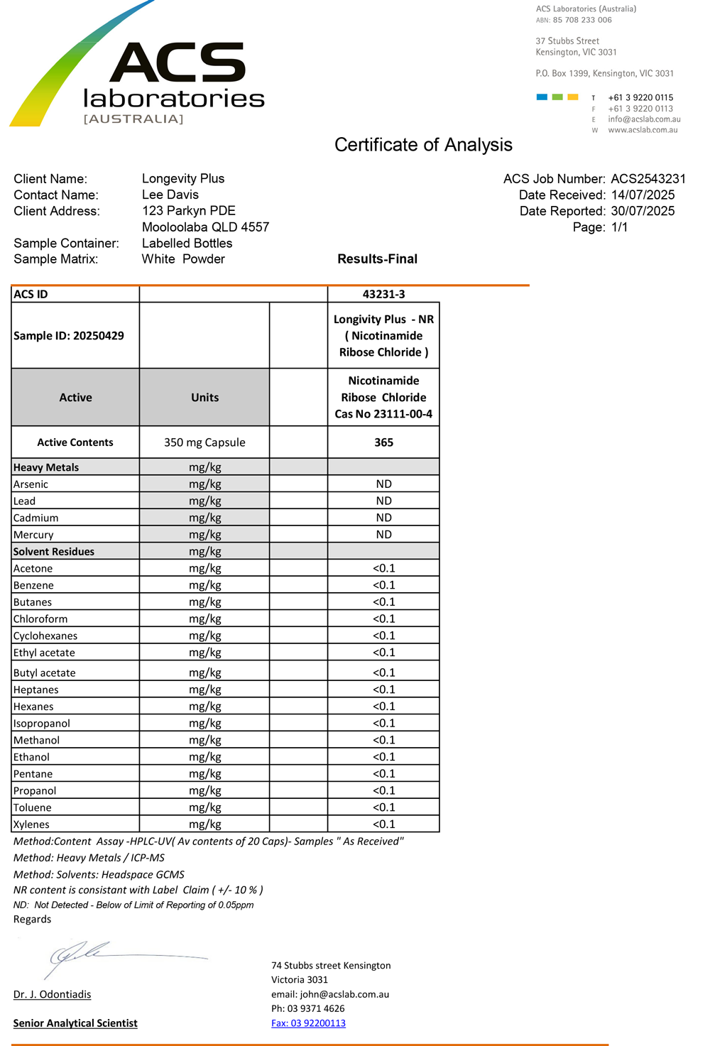 Once ingested, Nicotinamide Riboside is rapidly absorbed and converted into NAD+ through a specific salvage pathway in the body. NAD+ acts as fuel for your mitochondria the "powerhouses" of your cells helping generate energy (ATP), repair DNA, and activate sirtuins, a family of proteins associated with healthy ageing. By replenishing declining NAD+ levels, NR supports optimal cellular performance, promotes resilience against stress, and helps maintain metabolic balance and cognitive function as you age.